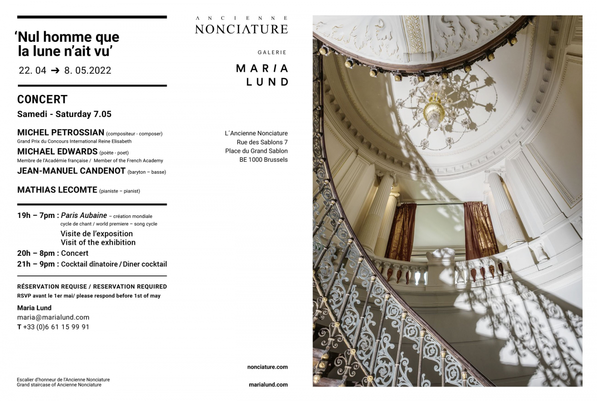 La création a eu lieu à la Galerie l'Ancienne Nonciature de Bruxelles, dans le cadre de l'exposition "Nul homme que la lune n'est vue" présentée par la galerie Maria Lund.